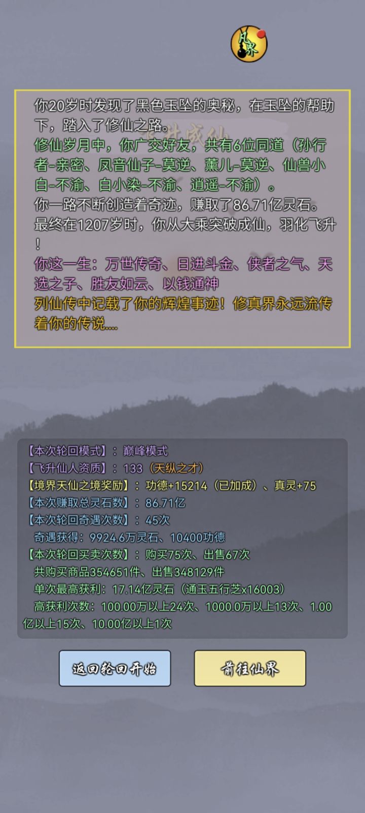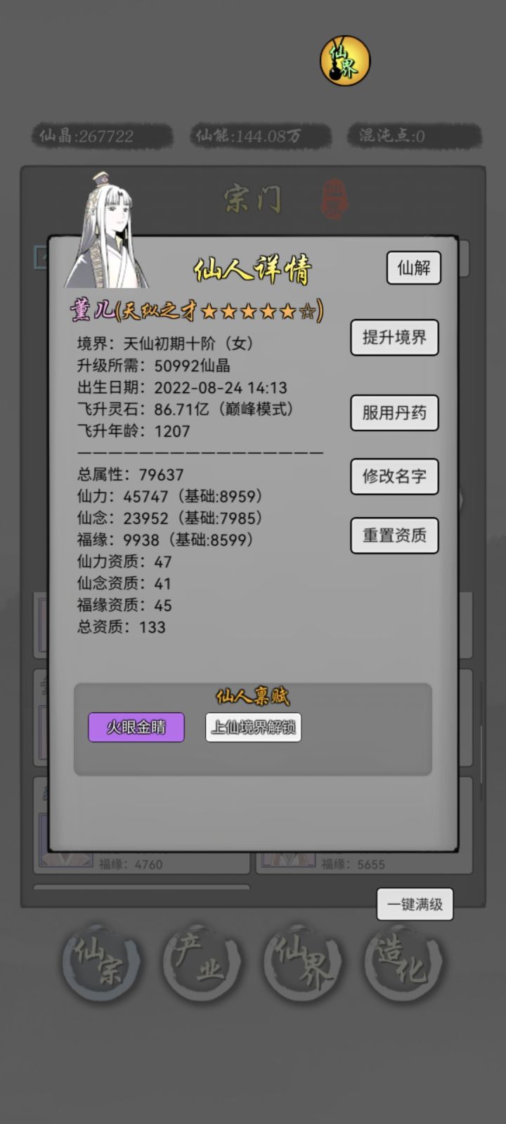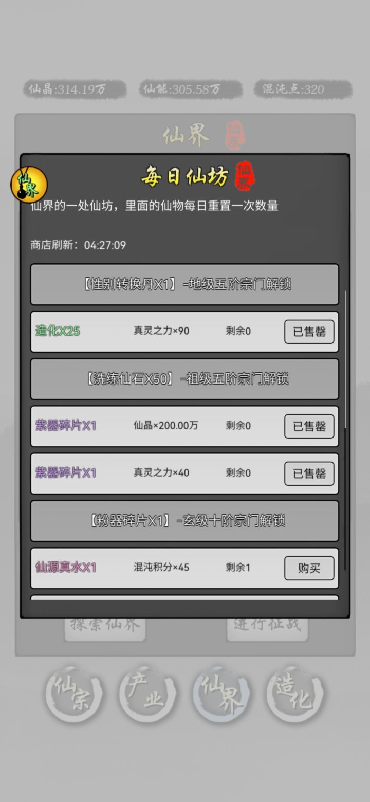 第2到4天,这个阶段,梯度升级仙人,比如3个上仙后期力仙人搞矿,其他的可以真仙后期,仙能够解锁就行了这个阶段可以拉点造化,到产业间隔满级肝帝:顶级肝帝5天内可以搞出来通圣(不建议,会封号,要找作者解封)如果再肝的话,可以刷功德,顺便刷禀赋刷第一个禀赋是实用橙,给主力换上,然后用人参洗二三禀赋(人参不值钱不用留)