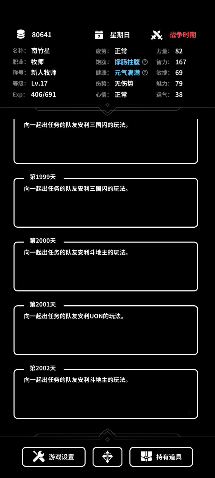 这个游戏里最强的天赋,选了之后五项状态属性永远不会低于“正常”以下,配合游戏无限工作bug之后是想死都死不掉,选了最强天赋之后另外两个天赋选什么都一样