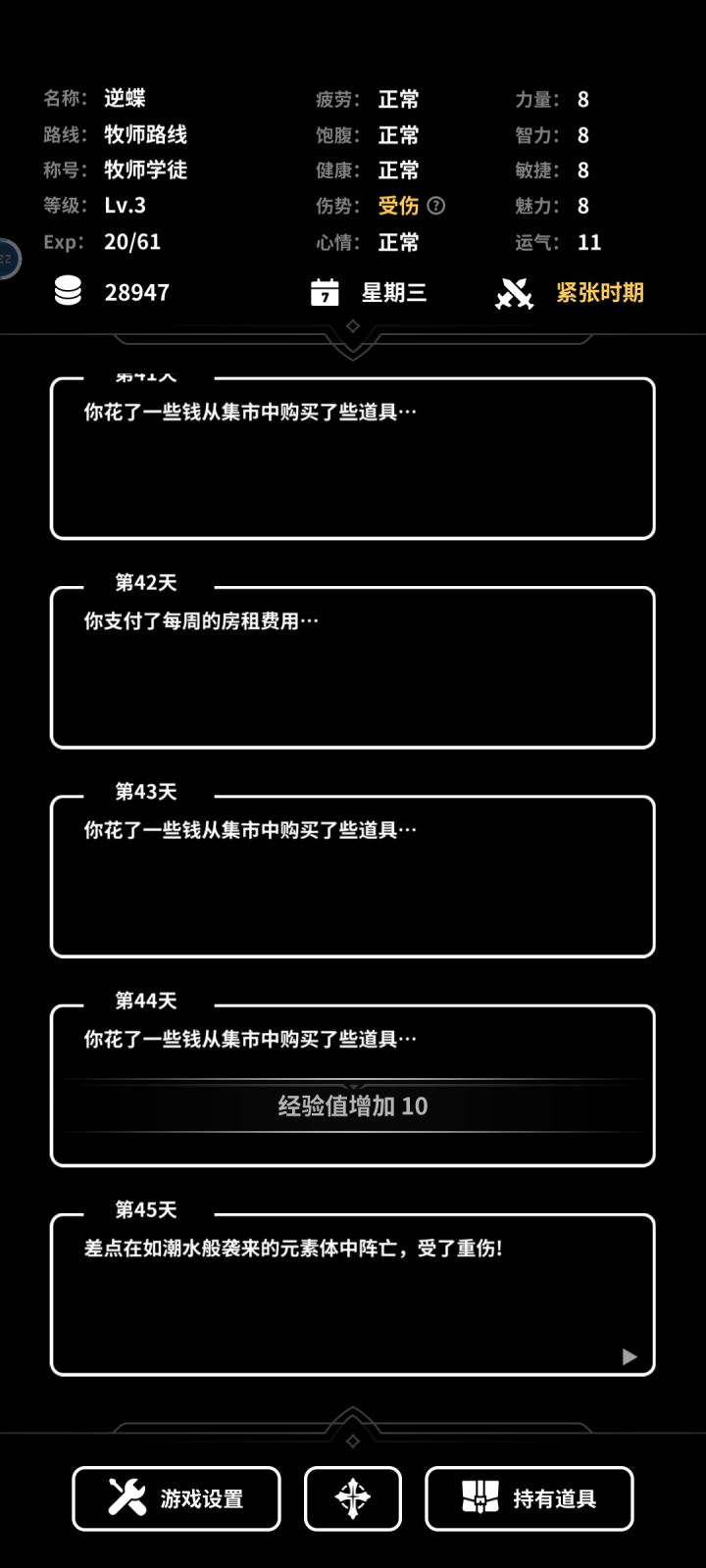 这个游戏里最强的天赋,选了之后五项状态属性永远不会低于“正常”以下,配合游戏无限工作bug之后是想死都死不掉,选了最强天赋之后另外两个天赋选什么都一样