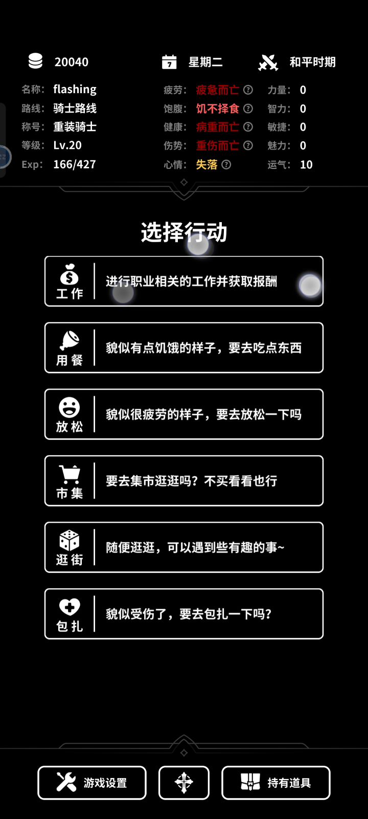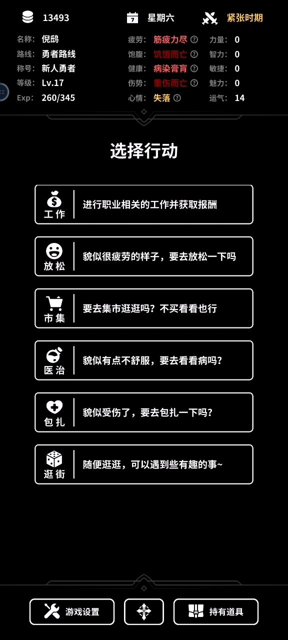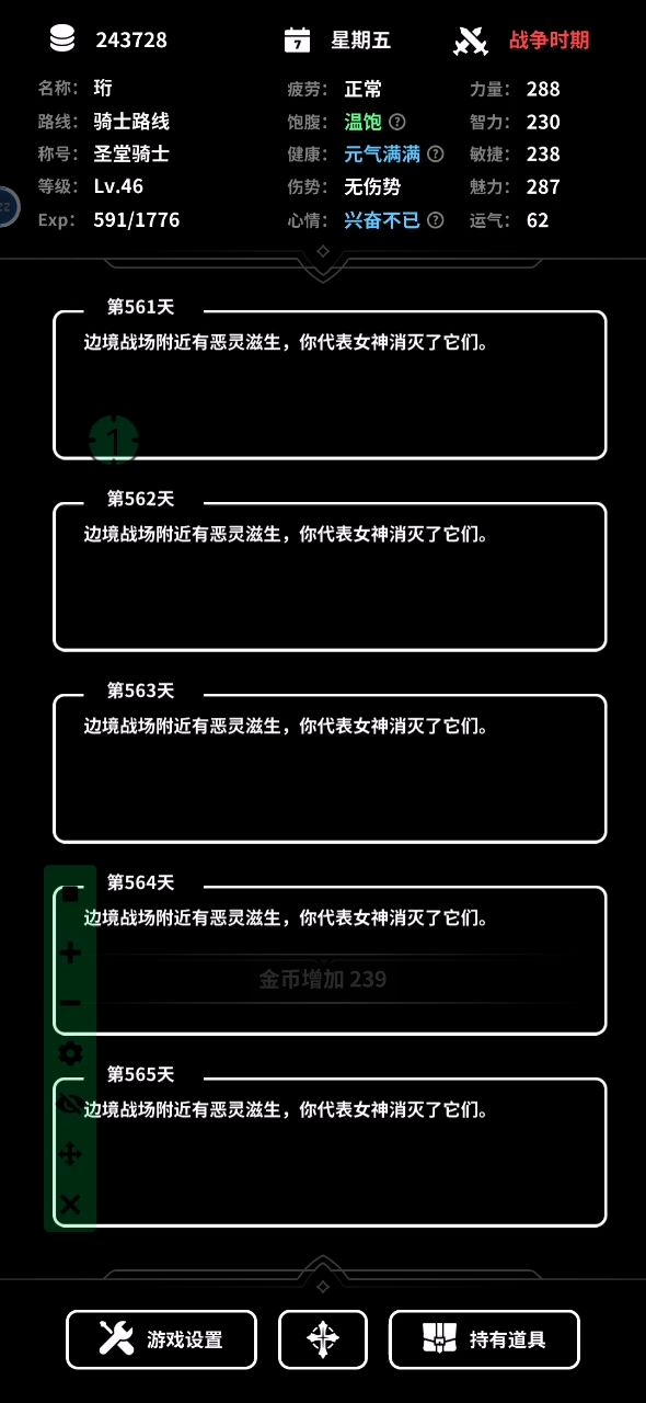 快速点击同一个按钮会导致不能正常地切换到下一天 这里可以一直刷工作赚钱然后点市集进入下一天 比较破坏平衡 特别是后期战争时期时工作不会掉心情饥饿等数值 可以无限刷钱和经验