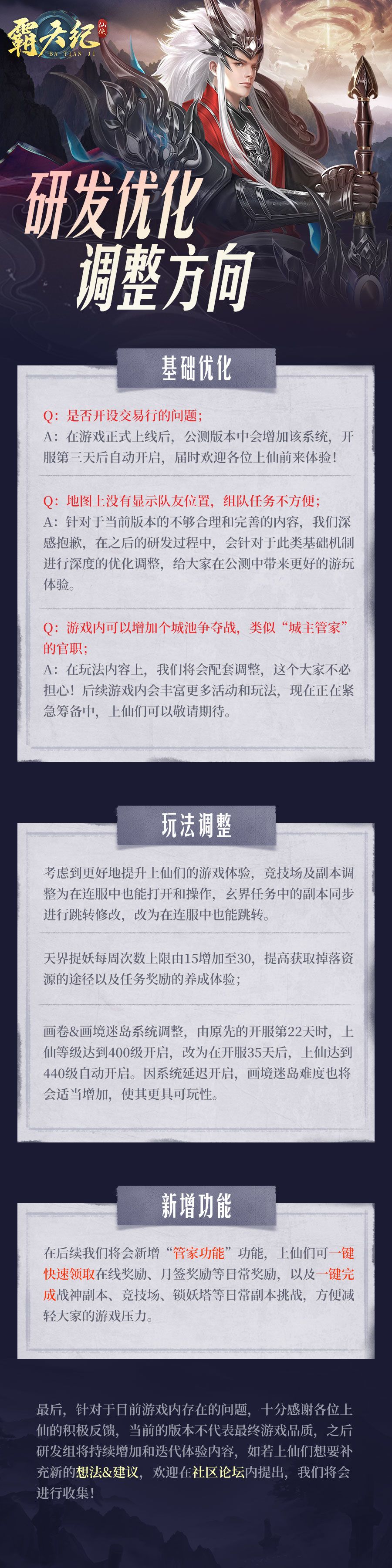 距离首测结束已有一周了小师妹这几日梳理整合上仙们所提出的建议和反馈,而针对于在上次测试当中的所存在的问题,研发组为此专门制定了一份优化调整计划,当然目前也正在加紧修改完善中,具体详情以长图的形式供各位上仙进行查阅 关于公测的具体时间还请上仙们稍安勿躁,如今研发组已经在加紧筹备当中,不久后洪荒大陆的大门又会再度向大家敞开!关于游戏内的更多消息请留意《霸天纪》社区论坛内官方消息哦