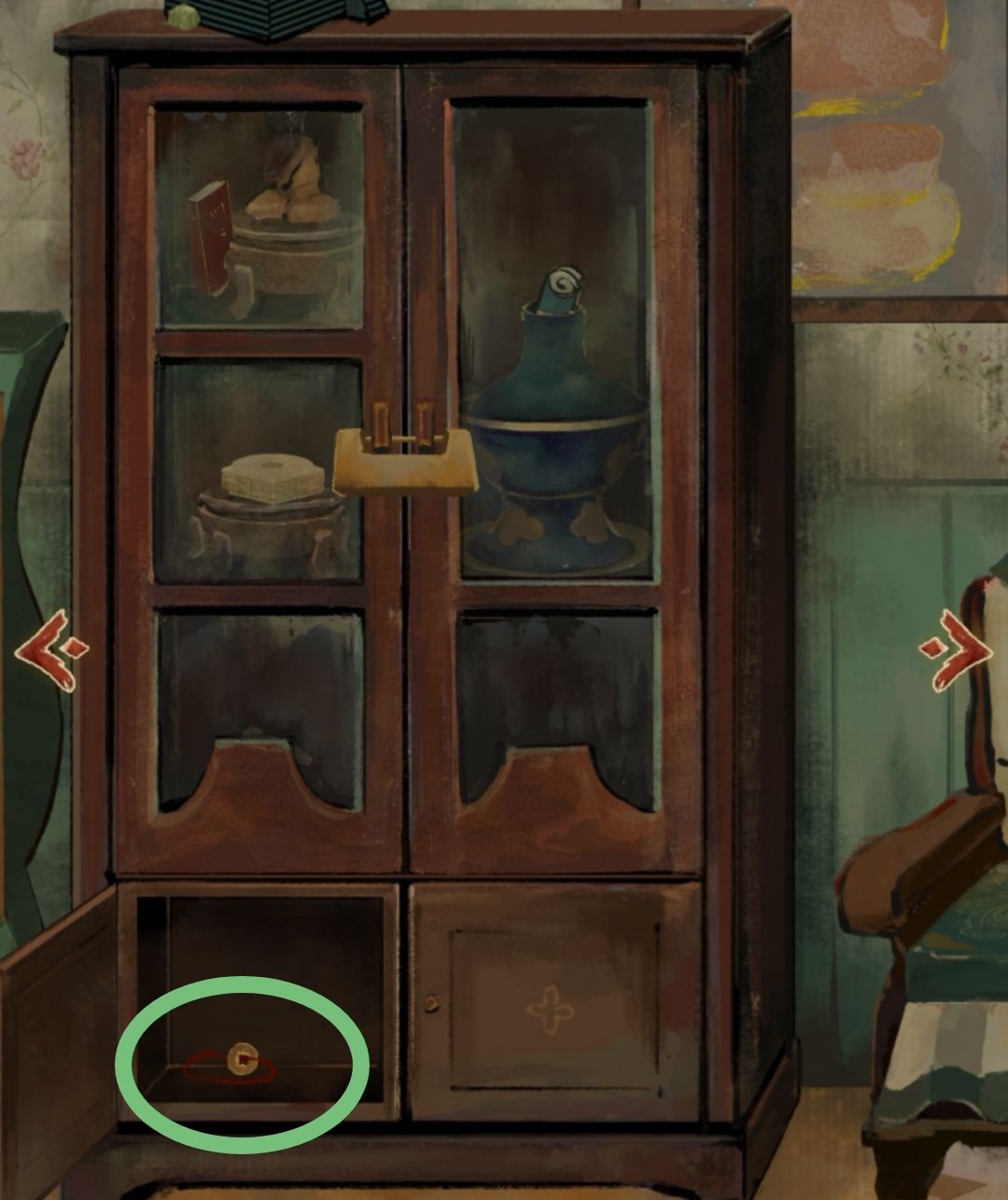 剧情过后开始翻自己家,恩解谜解到自己家就是不客气,柜子左下角打开获得铜钱手链,右转鱼缸下面获得一个红色珠子,调查鱼缸提示要找东西拿到龟甲和雕像翅膀,继续右转书架左上角记得拿到剪刀,这个特别容易被遗漏,因为剪刀和背景小盆颜色太像会被误以为是一个整体的摆件。 拿走右边中间黑色书,继续右转拿走右边中间黄色书、下面铜钱手链和上面两根金箍棒,中间抽屉打开获得两枚圆球跳棋,这里组合一下两根金箍棒就获得了长筷子