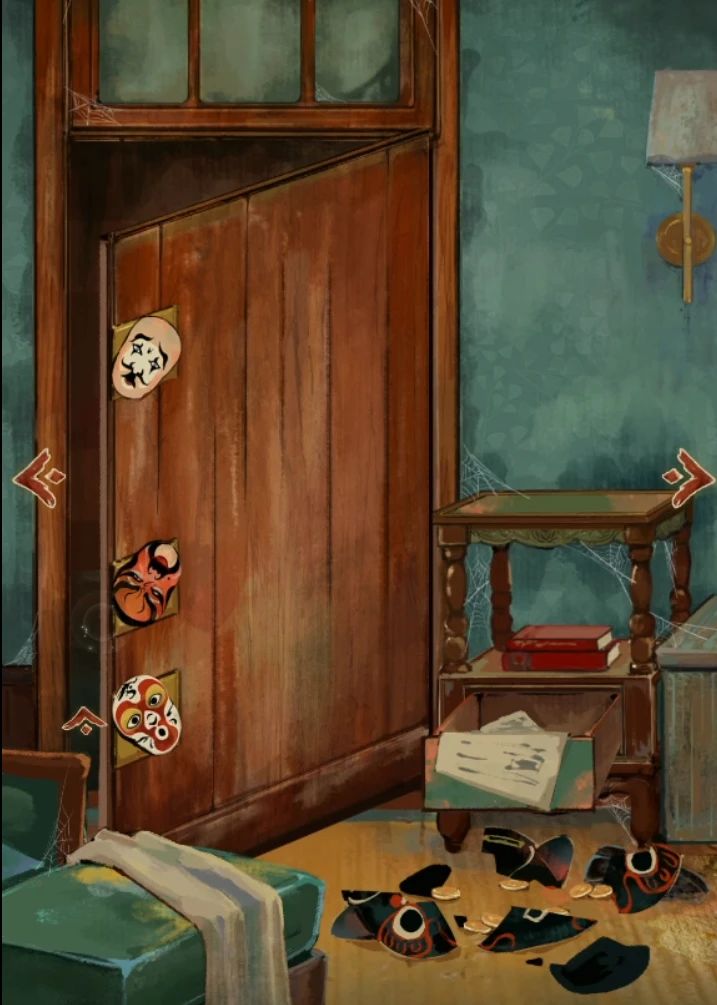 小哥哥声音好好听。。。 第一章 诡影 麂皮分割册子-花扣1 旗袍有鸟笼高度1243-摆锤 灯泡3个装了,麂皮擦镜子 旗袍花扣2,抽屉花扣3,打开箱子闪光灯 柜子相机+闪光灯拍照,调时-钻石 木槌分离-翻转安好+钻石敲镜子离开 螺丝刀+柄打开原房间板子-链条,面具钥匙1 烟灰缸砸碎猫头-面具钥匙2 马克杯装水-面具钥匙3 保险箱19620528-面具顺序 第二章 诡迹 球形装置,铜钱手串1 进房间,