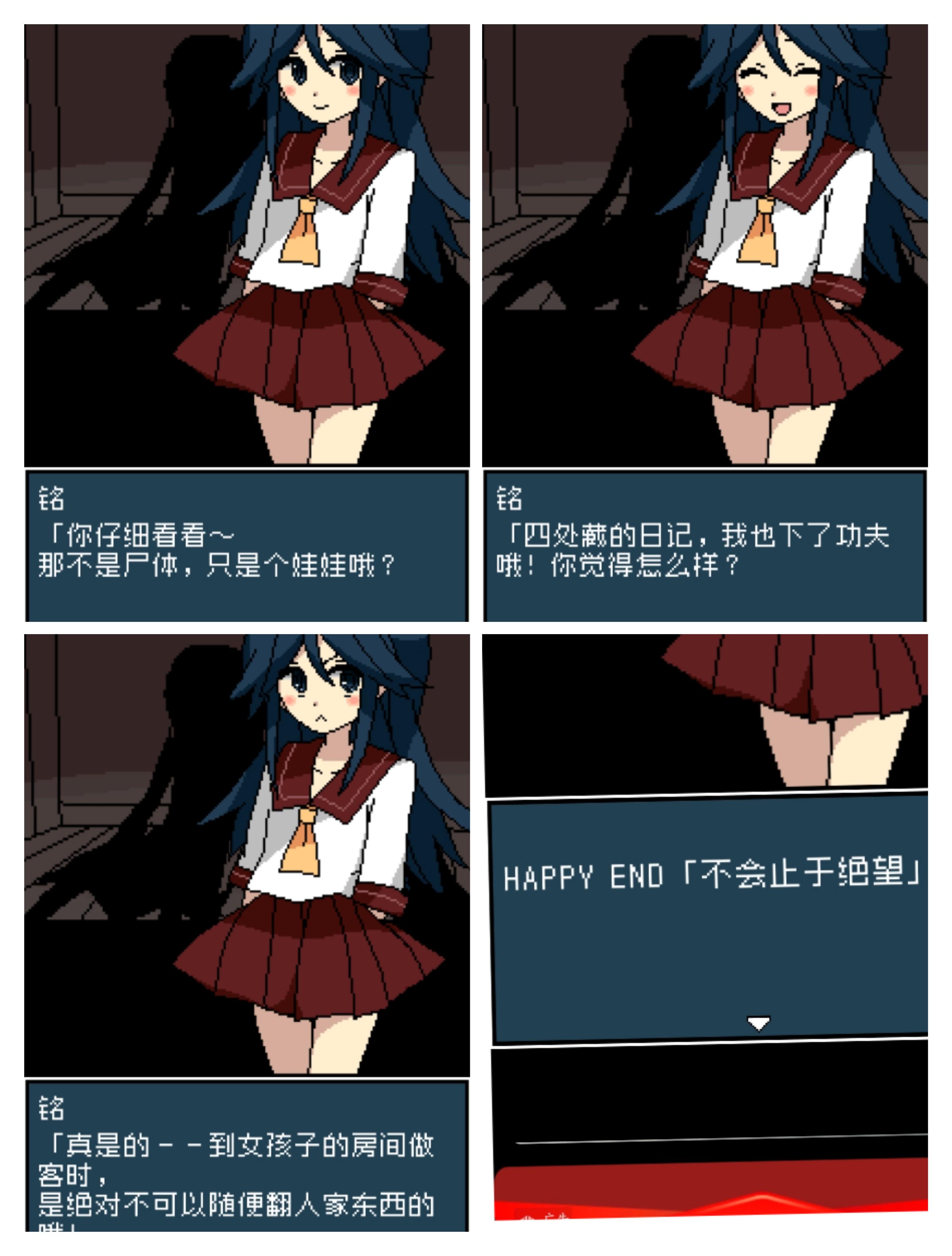 剧情体验:酗酒家暴的爹,漠不关心的妈,一直想要更好而不听学习却发现什么都改变不了的铭,以为雪丸会是依靠,结果是馋他身子的色批,在看到被学姐弄死的父母想要逃,不过好在是学姐给他弄死了,如果当时他出去成功报警,学姐估计一辈子都会围绕在这个话题痛苦的过完这一生,后来剧情中“我”(由玩家操控的真太郎)出现了,学姐因为雪丸的事情而抗拒下一段感情,因此,在“我”表白后带他来到自己家,让“我”看到了日记碎片一步步寻找下去,最后打开衣柜,看到被杀死已经腐烂的尸体,学姐猛然出现在身后“我”反应是 逃跑? 留下来 紧紧抱住(我会同你一起承担)