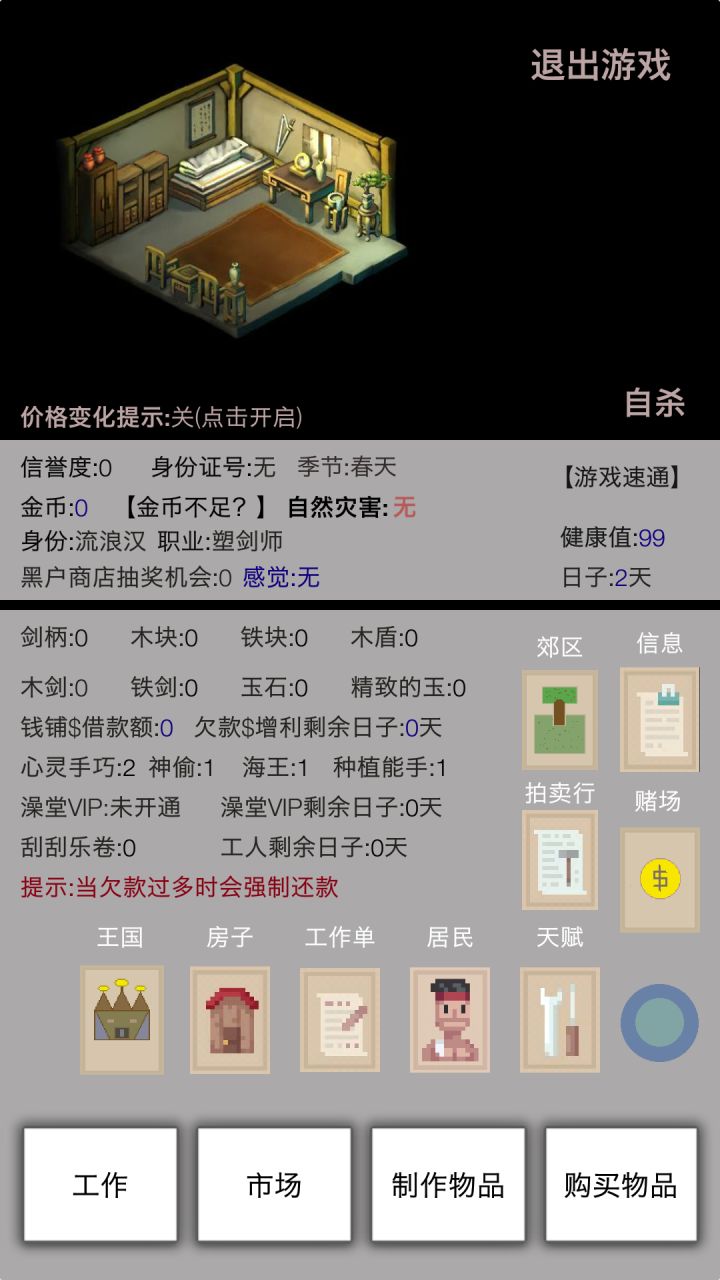 首先不要管健康,买好5个木块5个剑柄租好房子,以最快手速做5个木剑并把做成功的全部卖掉,钱用来买材料。不要一次性卖出全部木剑,一次卖5到6个就差不多够买10组木剑材料,做起来比较顺手。买材料→做木剑→卖木剑这样轮下去,一般就可以攒到20个木剑,这时候接工作单1可以立刻完成。拿到这笔钱首先还欠款,不然利滚利后面还不起了。这时候健康很低了马上去街道的饭馆吃套餐一回50健康值,有大小感冒的话多的钱就买个