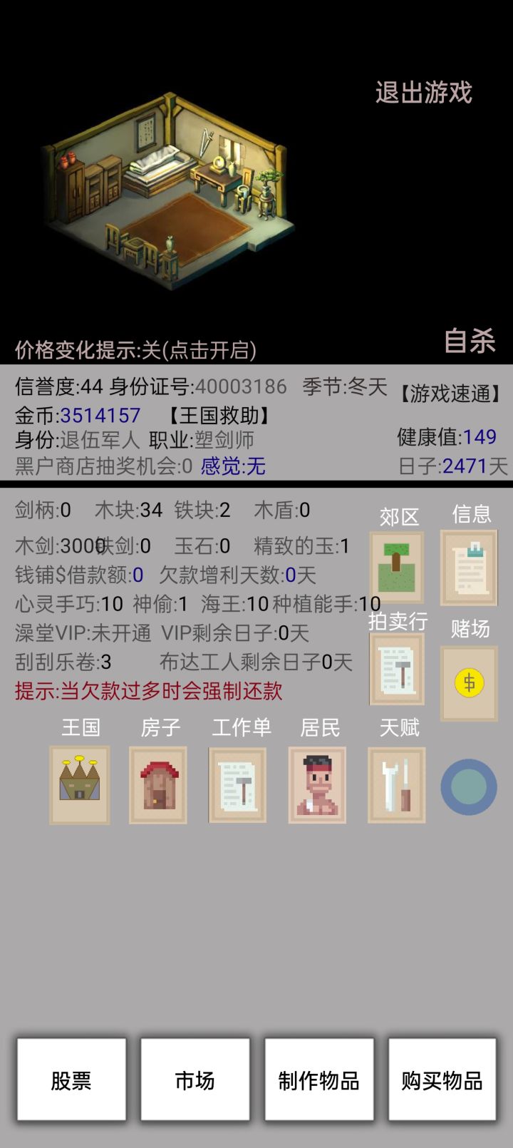 不用刷木剑(其实是我手速没那么快)直接贷款买身份(居民里面)然后去赌场(记得存档)直接全压。