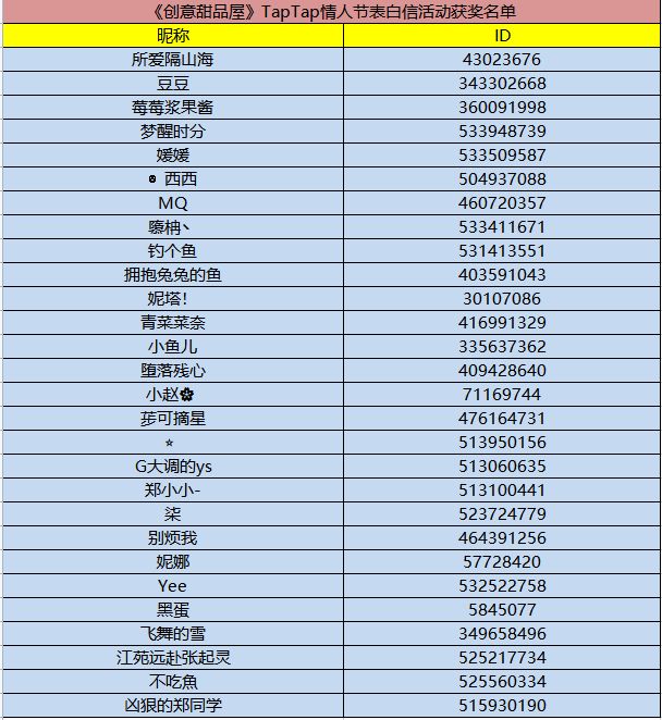 亲爱的店长们, 福利官管家来发奖啦!这次情人节表白信活动有28位店长参加。有点可惜没有达到最佳表白信奖励颁发的条件。这次店长们参与活动的积极性有点下降哦,是不是过完年后就养成了懒癌了呢。来看看这次表白信的获奖名单吧~ 再次恭喜以上获奖的店长哦! 获奖的店长们请添加我们的官方2群:793984967 联系管理员-【小花】 领取奖励超过2月27日未前来登记将视为放弃奖励~ 请获奖玩家尽快前来登记哦!