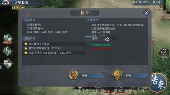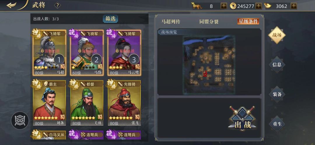 马超:四星30专武80级,五星雷火+四星轩辕铠+五星里飞沙 马云鹭:四星30专武80级,五星丈八蛇矛+四星霸王铠+五星紫电 马岱:一星60级,五星铁矛+五星兽面铠+四星风神盾 第一关、进军长安 此关最简单,马超直接往上走把副将引过来,下面营寨的李利留给其他友军打即可。关键是注意单挑,最后韩遂逃跑过关。奇遇在左上角的村庄,怕回合数不够建议另外做。 第二关、武威血战 开局马超往上走触发单挑,然后等小