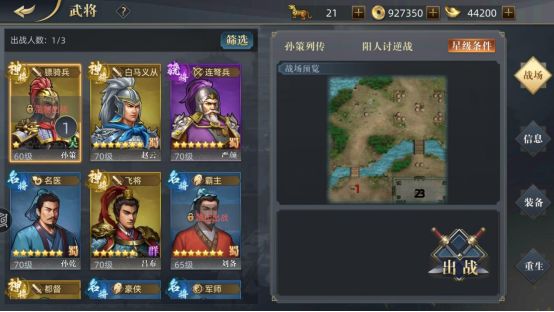 解锁条件:拥有孙策和周瑜 尽管给孙策套装可以有足够的续航(套装效果:受击回血5%),但是通常来说,平民玩家极少去培养霸王枪、乌骓,所以还是搭配你最强的装备吧。 第一关 阳人讨逆战(简单) 本关除孙策外,自选2人,建议输出,最好带一个远程,防止敌主将自杀。 敌平均16级,可以靠装备宝物碾压。 开局,祖茂被华雄阵前斩杀。 吐槽:是不是似曾相识?曾经有一关,就是从华雄手下救下祖茂。 3星要求是全灭,并触