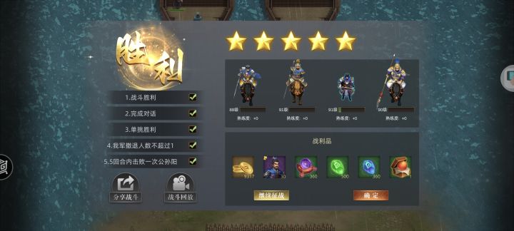 强制出战:曹操曹仁于禁徐晃程昱许攸曹洪本关对徐晃于禁练度需求较高建议起码升到90级。我的于禁9星了,必带牛头弩狼牙箭。徐晃必备龙鳞风嘴青囊书。金龟子不够的话先去打蜀汉周目。☆☆☆注意:本关有挑战模式注意:本关五星条件之一是五回合内击杀公孙阳一次。所以开始是最好多存档。确保于禁能命中公孙阳甚至暴击。第二回合友军阶段会进入剧情。于禁徐晃且战且退吧。公孙阳还会法术。争取5回