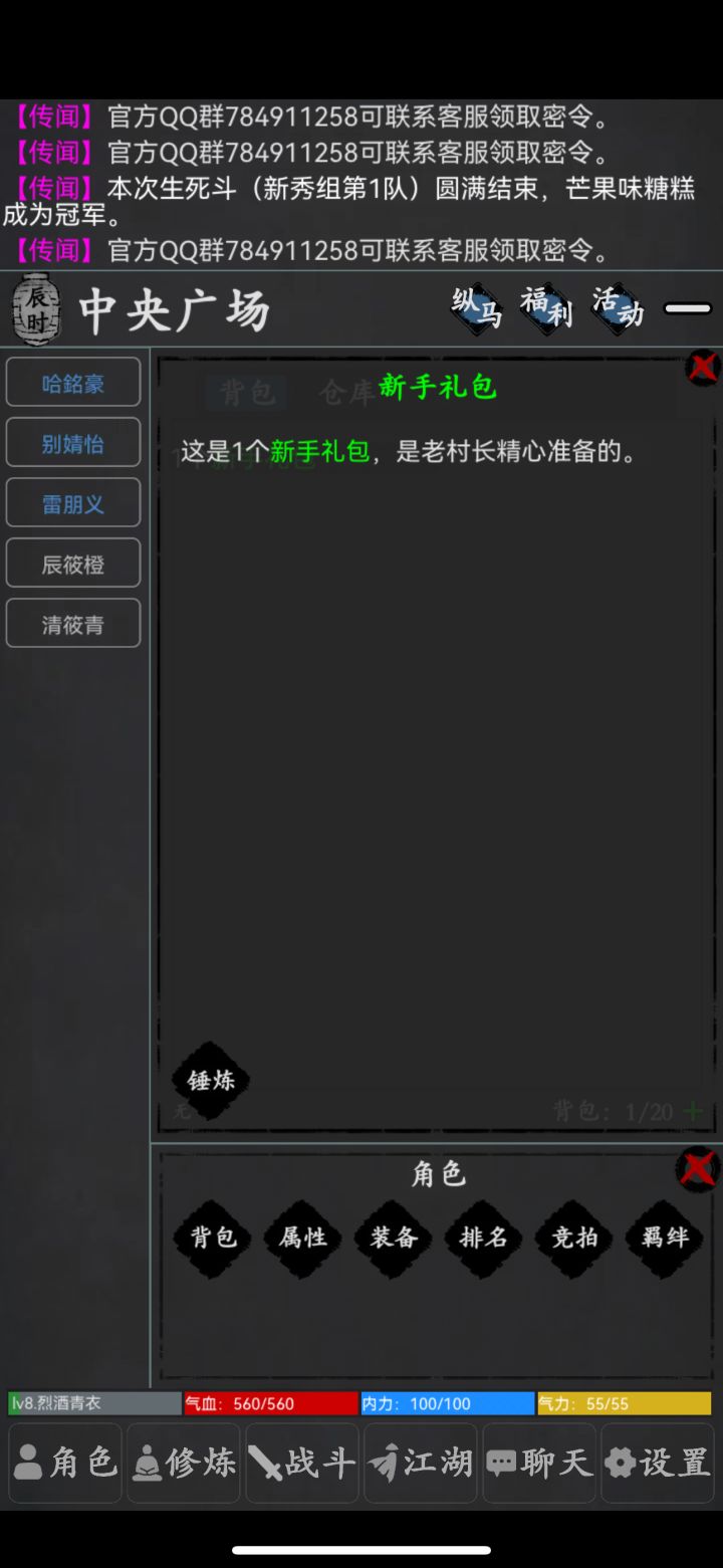 游戏没什么主线剧情,每天就是日常,升级,攒元宝,买神功,搞面板,水群。后期来说有两条路线,一个是卡49,79,109,(因为这是,三个不同的分组,很多活动都是同一组之间的竞争)一个是无限升下去,拿等级压人。卡级党追求完美的武功搭配,冲脉 ,装备强化。升级党则需要兼顾更多,武功搭配也要顾及潜力的消耗。对咯,记得点修炼-武学-修炼-吐纳。吐纳就是增加你的内力上限,这个增加速度恒定的,所以不用屯小还丹直