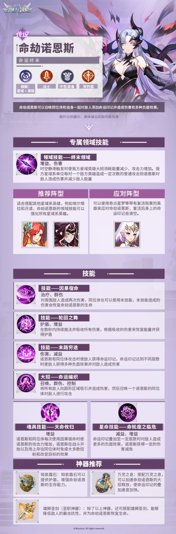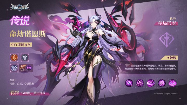 “准备好迎接末日了吗?”命劫诺恩斯可以召唤同位体,和自身一起对敌人添加命记,造成伤害和多种负面效果!领域技能可以使我方星域系英雄大招消耗能量减少、攻击力增加,推荐搭配其他星域系英雄,如埃尔塔拉和月读,提升大招释放频率!新英雄上线时间:2025/1/3