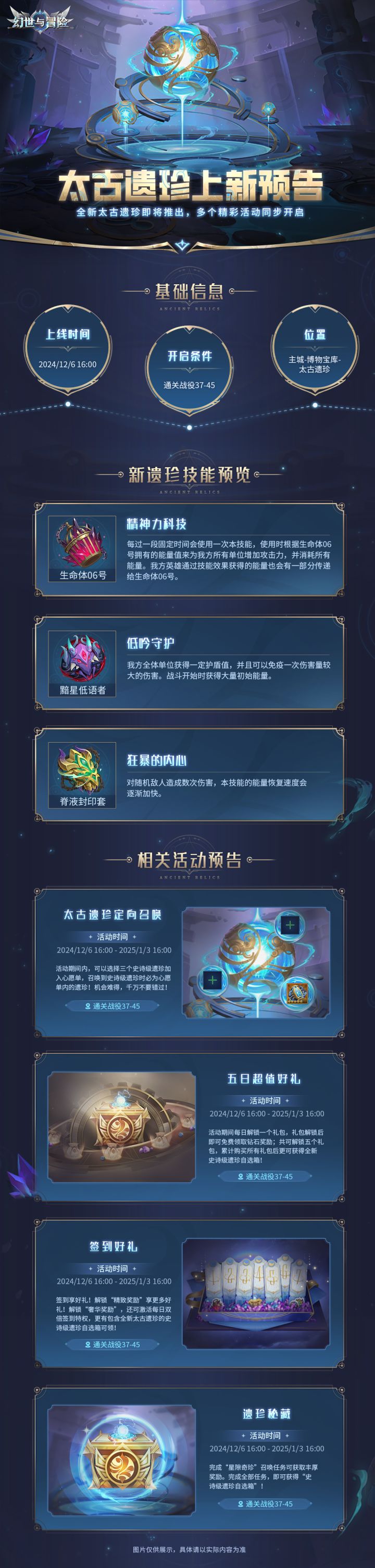 太古遗珍即将上新啦!本次将有精神力科技、低吟守护、狂暴的内心三个新遗珍登场。遗珍定向召唤、遗珍秘藏等相关活动也将限时开启!