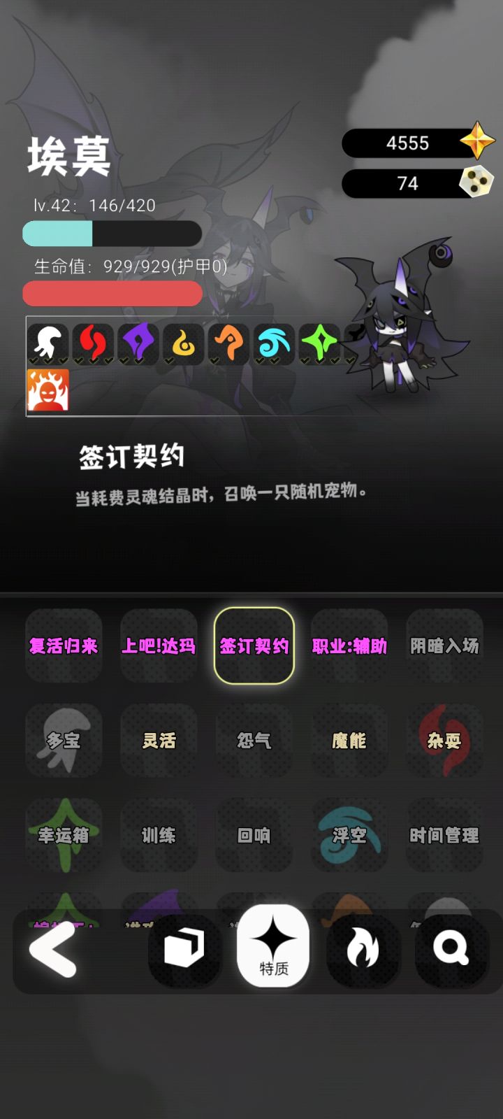 虽然是单机小游戏但是画风不拉垮 ,q版人物治愈风格 小魔女人物 有恶魔角和兽耳太正常,背景色偏暗 突出魔女主题 ,英雄角色做的不错 就是太少