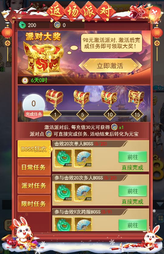 快乐加倍,限时累充来袭,游戏道具加倍返! 【活动内容】:单日累计充值达到指定金额可获得丰厚豪礼! 【活动时间】:2023.3.31 0点至2023.4.7 23点59分 【活动范围】:全体玩家 【活动奖励】: 1、单日累计充值达648元:化神礼包 礼包内容:仙玉*3000、召唤券*30、25亿经验丹*2 2、单日累计充值达1000元:合体礼包 礼包内容:将魂丹*3000、召唤券*30、25亿经验丹