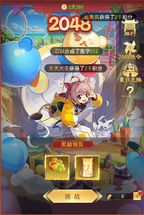 尊敬的仙友: 六一将至沐春风,遍地芬芳醉妪翁,果硕粮丰凭嫩蕾,国强民富待灵童! 祝仙友天真的笑容常在,健康的身体长存。 六一活动限时开启!众多豪礼等您来拿! 活动名称:2048(开服≥8天开启) 活动时间:5月31日-6月6日 活动内容:挑战2048活动可获得节日专属兑换道具‘节日气球’,收集达到一定数量即可在六一兑换活动-夏日兑换当中兑换豪礼,“沧澜洪荒”套装、SP通用升星石和众多豪礼等您兑换,