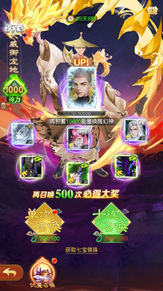 一、伏魔召唤阵 在召唤伏魔阵中, 1、可通过获取「七宝佛珠」进行召唤,每召唤满500次必得大奖; 2、消耗100「七宝佛珠」可进行单次召唤,消耗1000「七宝佛珠」可进行十连召唤;积蓄满10000能量可唤醒幻神「大威御龙地藏」; 3、七宝佛珠 道具描述: 用于召唤伏魔阵活动中召唤珍稀奖励 (*活动截止后,道具将自动兑换为元宝) 获取途径: ①地藏伏魔传——围攻养龙寺 ②地藏伏魔传——伏魔令 ③地藏