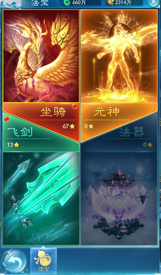 新手提升战力主要有四个方向: 角色属性、法宝、仙术和神将。 之前的文章内容已经介绍过角色属性,现在介绍一下游戏里的法宝系统。 二.法宝 点开下方的法宝按钮,可以看到四个板块,分别为坐骑、元神、飞剑和法器(暂未开放),新手最先接触的是法宝中的坐骑。 坐骑 坐骑也分为多个等级(例如:SR、SSR、SSSR、UR等),坐骑等级与坐骑战力、神力等,都息息相关;等级越高,战力和神力也越高。 获得坐骑主要有以