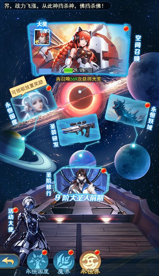 2023年7月4日0点!全新修仙玩法-圣修来袭,血肉苦弱,机械飞升!开服80天且修仙达到仙人6转后,从修仙界面进入完成圣阶修行任务后,即可开启圣阶修行!一、圣修更新内容1.【新增成长】圣修--圣修等级使用经验提升,开启圣修后,经验不再自动消耗,需要手动分配给角色升级或圣修升级。--提升圣修等级获得量子神识属性,战力大幅膨胀!2.【新增闯关】永恒国度--开启功能后,可在主线关卡界面切换