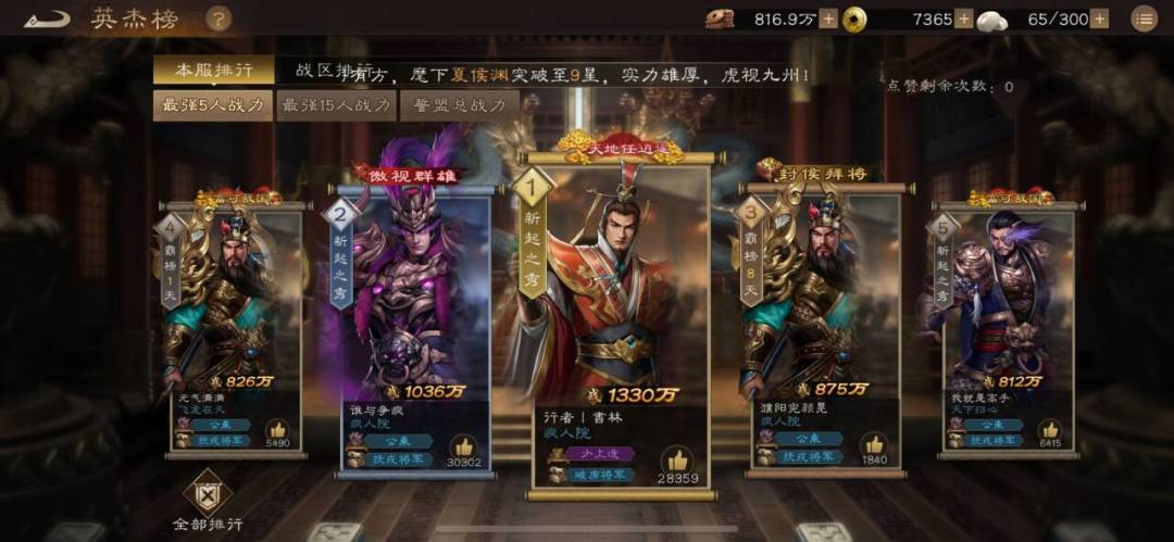 一、最强战力 榜首:行者|書林,同盟:疯人院,战力1330万; 第二:谁与争疯,同盟:疯人院,战力1036万; 第三:濮阳完颜晃,同盟:疯人院,战力875万; 第四:元气满满,同盟:飞龙在天,战力826万; 第五:我就是高手,同盟:天下归心,战力812万。 战力前三都是疯人院的大佬,不愧为一区第一盟。有不少小伙伴好奇,榜一大哥氪了多少?据说是60+大不溜。卧槽,差不多小县城一套房子了,但对大佬来