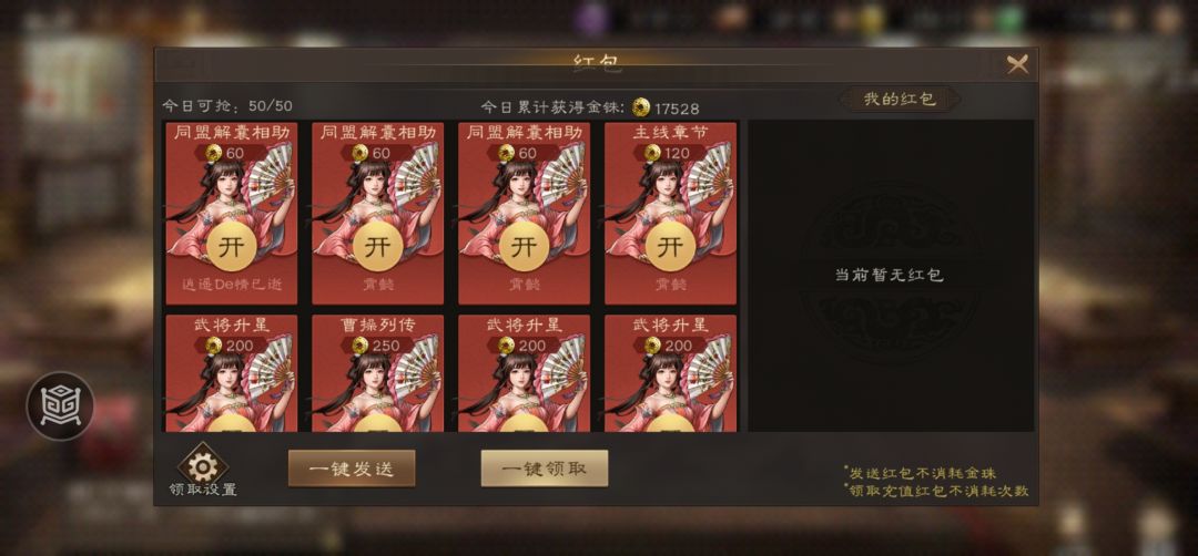 网游一般都有个工会同盟啥的,三曹也不例外,祖国强大了人民才能更幸福和拥有自豪感,游戏也一样,找到一个强大的组织也很重要,抱团取暖。 红包玩法:我这个盟氪佬很多,氪过后还能互相发红包,这种红包领取还无上限,第一天光领到的金珠红包都快2万了,氪佬们果然恐怖如斯,别问我斯是谁,问也只能回答你斯是陋室…越早到达30级越能尽早加入一个强大的盟,所以前两天尽可能买8元馒头冲等级。 除了充值红包外其他红包是有领