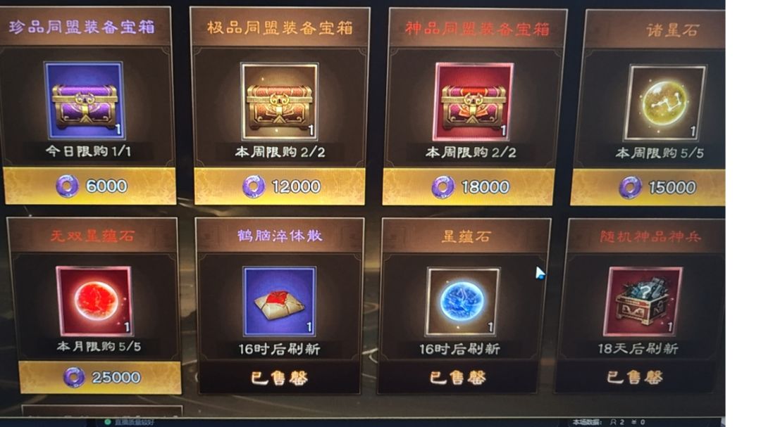#新三国志曹操传 #新三国志曹操传创作者征集令 #新三国志曹操传攻略测评 #三国 #发现好游戏 #战棋游戏 #找点游戏 同盟商店一共有8级,之前有过一次改版,将7级商店的洗练石改成了阵营抽,同时8级商店将解锁无双抽,那么价格如何呢? 如图所示,黄抽每周都可以换5个,价格共7万5币,而红抽则是每个月只能换5个,价格共计12万5币,同时每个月可以用18万换一个神兵,24万换两个紫稀有星符,理想情况下