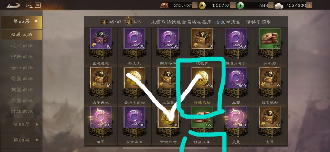 曹操传里目前除了氪金外,有三样东西最重要,无双币,皇图霸业券以及金株。 除了固定的收入外,怎么获得更多的金株呢,那只有同盟试炼宝箱了。 关于这个游戏该怎么玩,怎么玩的好,已经有太多太多的攻略了,今天我来带大家走进一个不一样的攻略范围-玄学。 首先记得洗手上厕所,然后在心里一定要暗示自己,这次肯定是金铢。 入正题,你可以看到我分享的图片在同盟试炼62-63里,一共获得了7次金株宝箱。 别羡慕,学会了