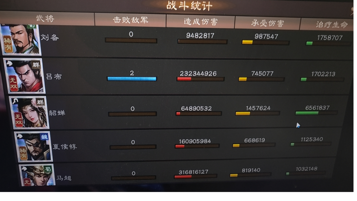 不上奶妈争取输出最大化,上了最强的几个输出武将,夏侯惇,吕玲绮,吕布,夏侯渊,貂蝉。我的关羽是比吕布战力高的,无奈不会吸血,生存压力太大,又没有多余的日日星符可戴,只能让位于吕布了。 刚需:貂蝉要戴水月星符,配合自身天赋每回合解除我方输出武将的减益buff,夏侯惇核心输出配了日日星符,吕玲绮和吕布由于会吸血,生存压力没不戴日日星符的夏侯惇那么大,所以都带了增加输出的星符了,夏侯渊蹲在后方可以安心输