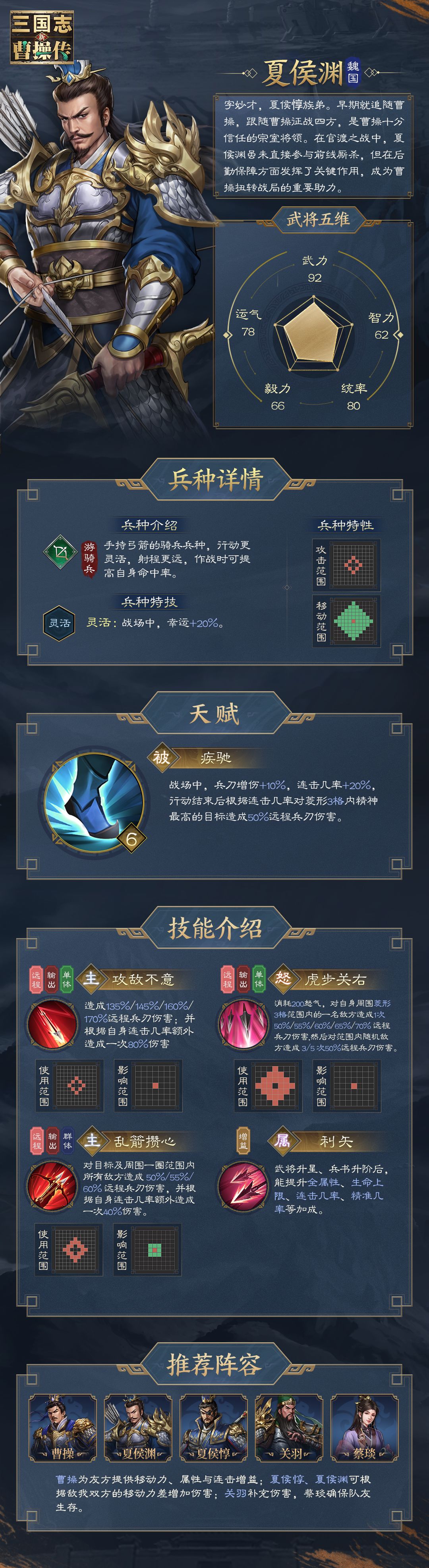 由光荣特库摩正版授权、中手游联合发行的《新三国志曹操传》即将于2025年6月27日正式上线,本期就来预览武将夏侯渊的攻略信息,提前解锁这名武将的真正潜力。 【虎步关右 · 夏侯渊】 夏侯渊以用兵神速、作战勇猛著称,曹操曾称赞其”虎步关右,所向无前“。其深受曹操信任,随曹操征战四方,在战场中发挥了许多关键的作用。夏侯渊作为输出和远程的游戏定位,在沙场上提供着强大的战力支持。 【武将信息】 兵种:弓骑