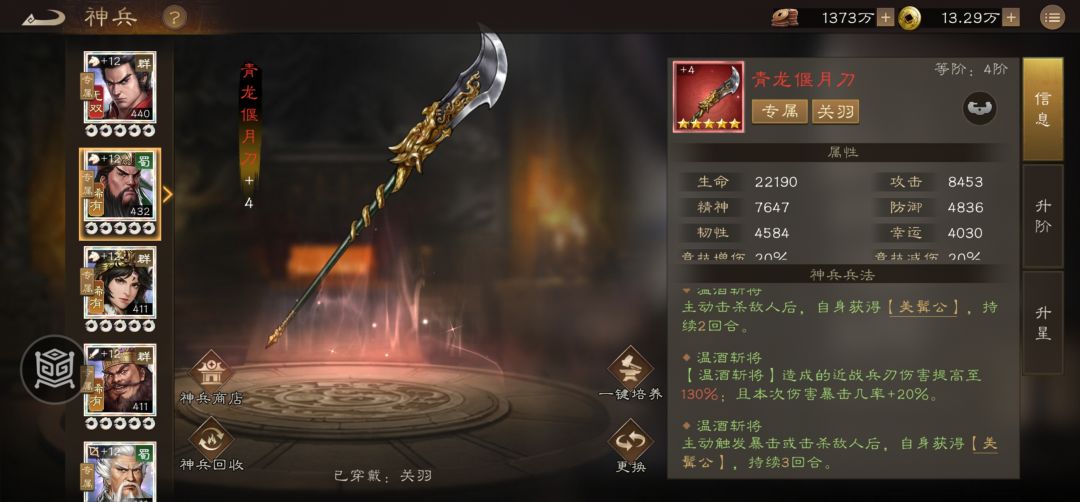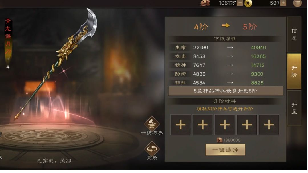 大家好啊 我是英雄哥 相信很多小伙伴都不太清楚神兵到底怎么升星 其实就是用相同的一星的神兵来合成 从一星升到四星需要四把神兵 但是一星升到五星却需要六把 所以呢什么样的神兵才够资格让你一次拉到满星呢 首先一定是二爷的刀 五星可以说是永久buff因为只需要暴击就能加上美髯公 相比于三星而言 就必须击杀目标 那么在与大型boss对战的时候 你怎么可能击杀呢 三星的buff机制相当于没有 所