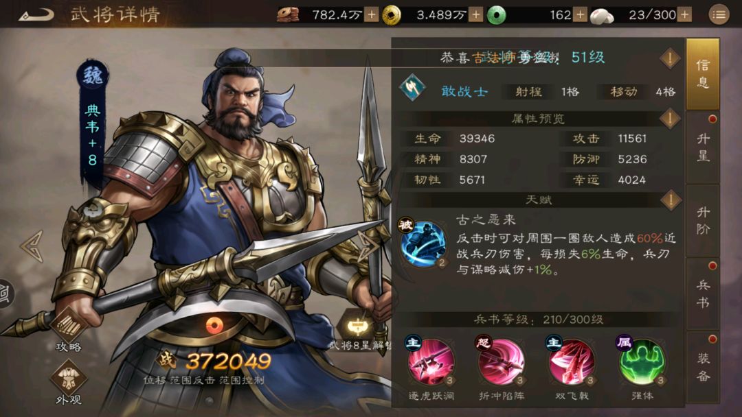 典韦的五维为:武力98 智力52 统率76 毅力98 运气68 天赋技能:反击对九宫格60%近战兵刃伤害,每损失6%生命,兵刃谋略减伤+1% 兵种兵法:精兵-连击几率+9.5%,树林适应性 大招: 折冲陷阵-满级效果 九宫格80%近战兵刃伤害,根据自身连击率额外造成40%近战兵刃伤害,并且施加2回合4层撕裂(受击+2.5%最大生命真伤),自身每损失1%生命,本次伤害提高1% 攻击方式:九宫格 核心