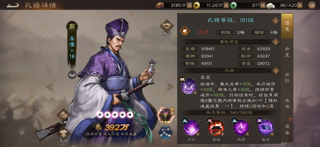 #新三国志曹操传创作者征集令 #新三曹金秋福利盛典开启 随着周瑜小乔出炉。李儒彻底被激活。李小周组合现在太猛了。他们核心有2。其一真伤流,其二持续伤害。 我们先看看李儒神兵效果: 4星效果:普通攻击与反击攻击替换为兵法[诡计] :对菱形2格范围内的单体敌方目标造成130%毒系谋略伤害。 5星神兵效果 李儒死亡后对白身周围3圈范围内的所有 [鸩毒]:(持续伤害)行动结束:随机减益效果后,(受到2