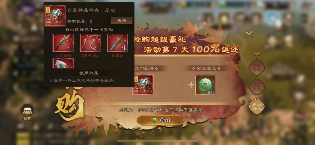 幸运观星:稳定出稀有的唯二手段之一,零氪基本能做完两轮(运气好三轮) 西域商队:另一个出稀有的地方,因为第四轮才出神兵奖励,所以前期主力稀有将没满星的话可以冲一下。一个主力稀有满了之后就可以攒券攒钱抽神兵 转盘:零氪屯屯鼠活动,比较稳妥的出神兵的地方 无双抽:也是屯屯鼠活动,攒到150抽的神兵奖励再下手。无双将对零氪作用不大 首领箱子:零氪攒箱子等活动开就行 皇图霸业:攒够550个券换神兵