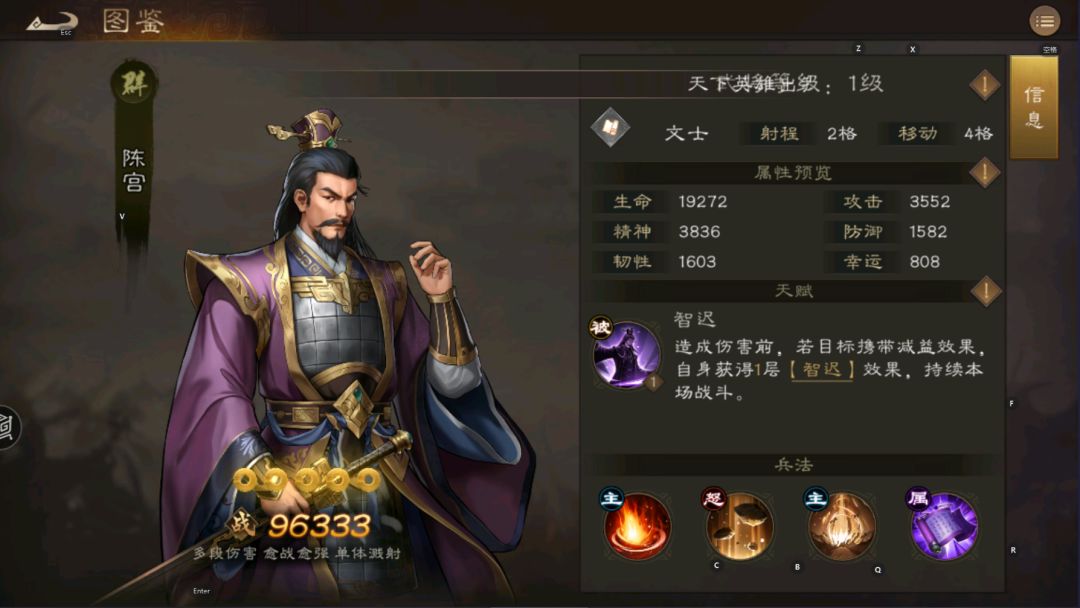 陈宫的五维为:武力68 智力90 统率76 毅力64 运气52 天赋技能:谋略伤害+15%,精准几率+20%,造成伤害前对自身施加智迟效果(如果目标有减益效果,自身精神+1%,最高30层) 兵种兵法:冥思-谋略伤害+10%,建筑物适应性 大招: 策定乾坤-满级效果 对目标以及2格造成2次60%土系谋略伤害,如果自身有满层智迟,则额外增加一次75%土系谋略伤害 攻击方式:2格 核心技能:造成160%