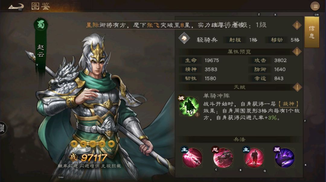 赵云五维为:武力96 智力68 统率96 毅力86 运气64 天赋技能:开局100%闪避一次,3格范围没有一个敌军自身闪避几率+3% 兵种兵法:飞驰-兵刃伤害+5%,平原适应性,不适合在建筑 大招: 满级效果 2格155%兵刃伤害,范围内只有2名敌军,伤害+60%,只有1名敌军,伤害+100%,如果暴击,自身100%闪避一次 攻击方式:九宫格 核心技能 龙胆慑敌-突进3格,然后对九宫格范围造成12