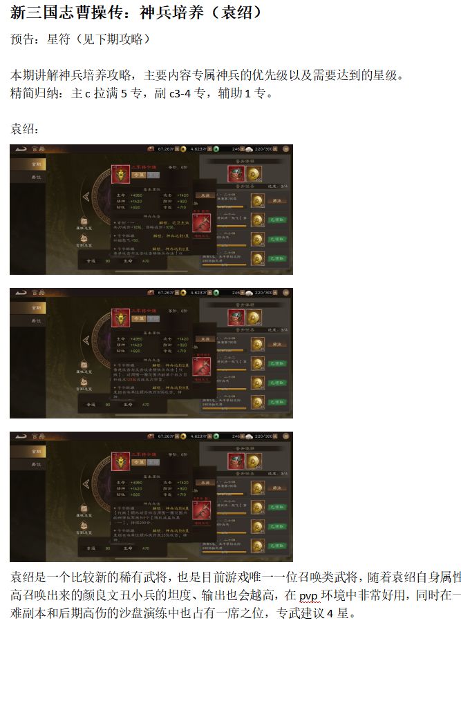 新三国志曹操传:神兵培养(袁绍) 预告:星符(见下期攻略) 本期讲解神兵培养攻略,主要内容专属神兵的优先级以及需要达到的星级。 精简归纳:主c拉满5专,副c3-4专,辅助1专。 袁绍是一个比较新的稀有武将,也是目前游戏唯一一位召唤类武将,随着袁绍自身属性的提高召唤出来的颜良文丑小兵的坦度、输出也会越高,在pvp环境中非常好用,同时在一些困难副本和后期高伤的沙盘演练中也占有一席之位,专武建议4星。 #