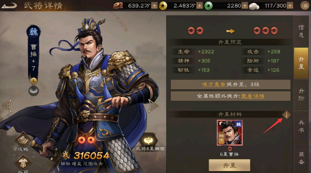 最近老是看到一些玩家问,我咋个算我升级每个星级要多少本体和狗粮,我最开始也是很懵逼的,但是经过我的研究,只需要大家点击升星位置的!号,就可以查看咯,详情见下图咯 另外还有寻宝,我看也很多人不会,这里附带个大佬的攻略 如果觉得有用,给我点赞啊!!! #新三国志曹操传军机品鉴