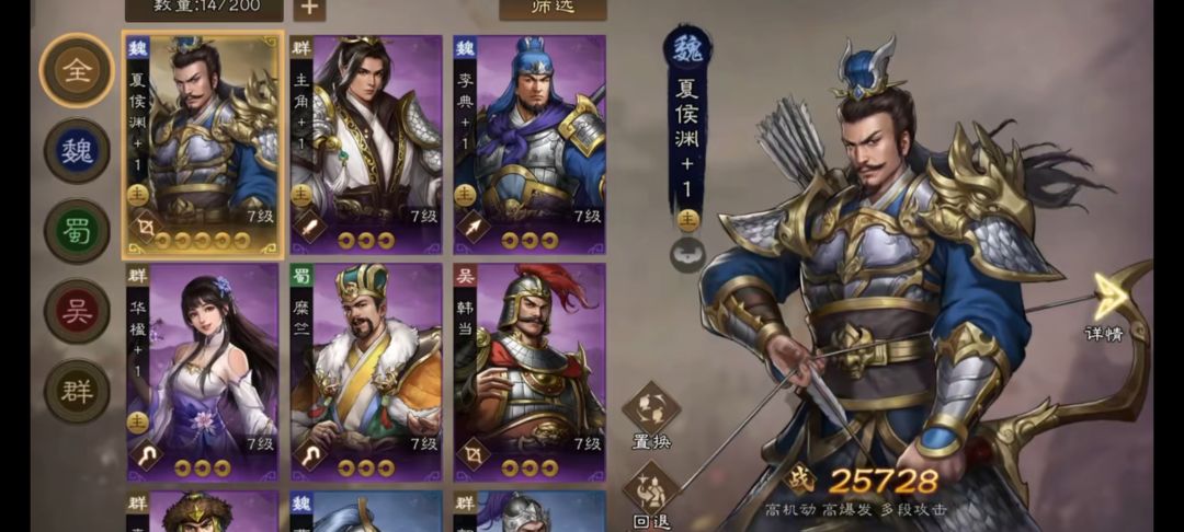 这篇介绍一下抽到哪些武将能做主力,哪些武将只能当狗粮,也不是所有不能做主力的将都毫无用处,紫色品质的迷竹袁术马腾周仓也有用武之地。 首先是稀有武将,能标上稀有的都无法做狗粮,抽到了一时半会用不到的也都留好,以后都用得上,前期看着无用,像陈宫,孙策这种玩的人不多的也不代表本身就垃圾,只不过需要成体系和高星后才能发挥真正实力。一般常规能作为主C养得稀有,魏国有夏侯惇,蜀国有关羽,吴国有孙策,群雄有吕玲