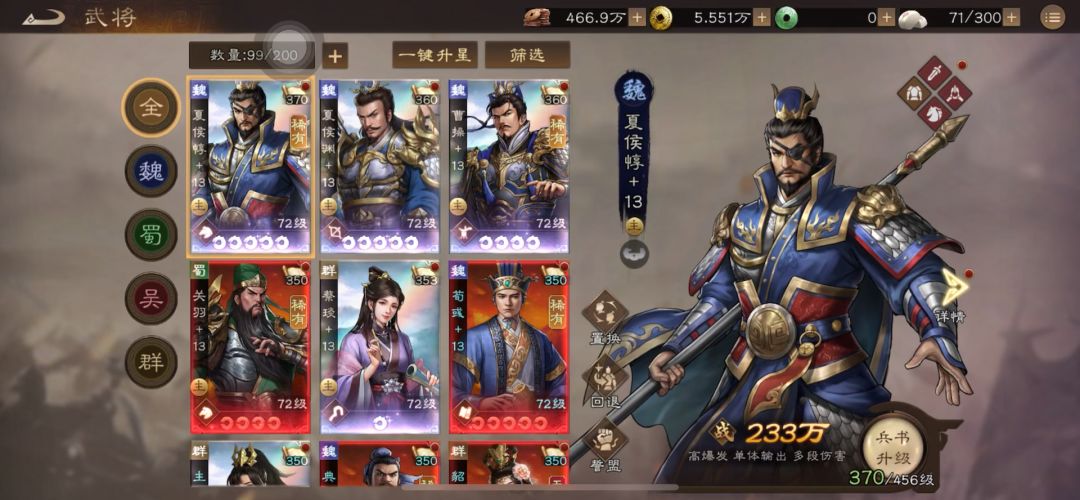 蜀国:(优先度仅比较同稀有度,“刘备-低”肯定比“法正-高”的优先度高) 刘备-低。能奶能buff,奶妈天生没人权,还要和部队一起行动,buff蓄力只生效一击,暴击概率buff属于最差的伤害提升buff。只能增加概率,不能提高上限,能不能秒杀对手是天与地的差别。神兵极大提高了队伍第一击的伤害,神兵5星增加全员15%爆伤。提升较大,锦上添花。 张飞-中。超高伤害大范围aoe以及减防debuff,大招