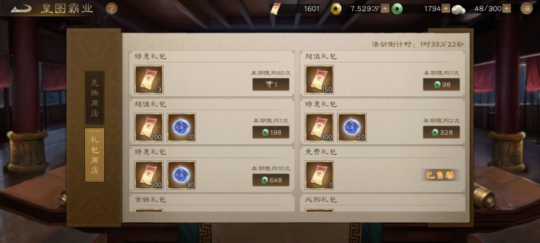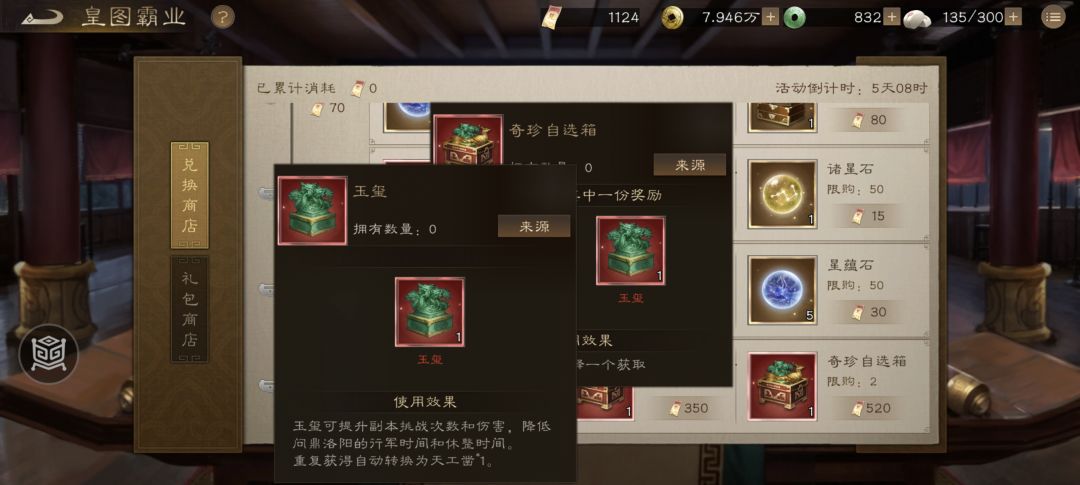 目前最逆天的奇珍:神兵、星耀和首领次数各加一,同盟首领和沙盘增伤10%,长期玩的,不论是否氪金都必拿。 分析一下如何2个月拿到2星玉玺,一共需要2040张票 一次活动免费获取票数:每日任务20*7天=140券+限时任务40券+金铢购买20*3=60券+免费礼包(每日刷新)1*7=7券=247券。 皇图霸业结束后的开箱有礼活动:100券。 2个月会经历4次皇图霸业和3次开箱有礼活动,免费获得247*