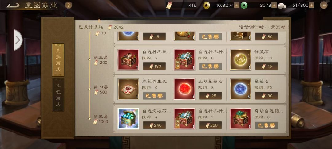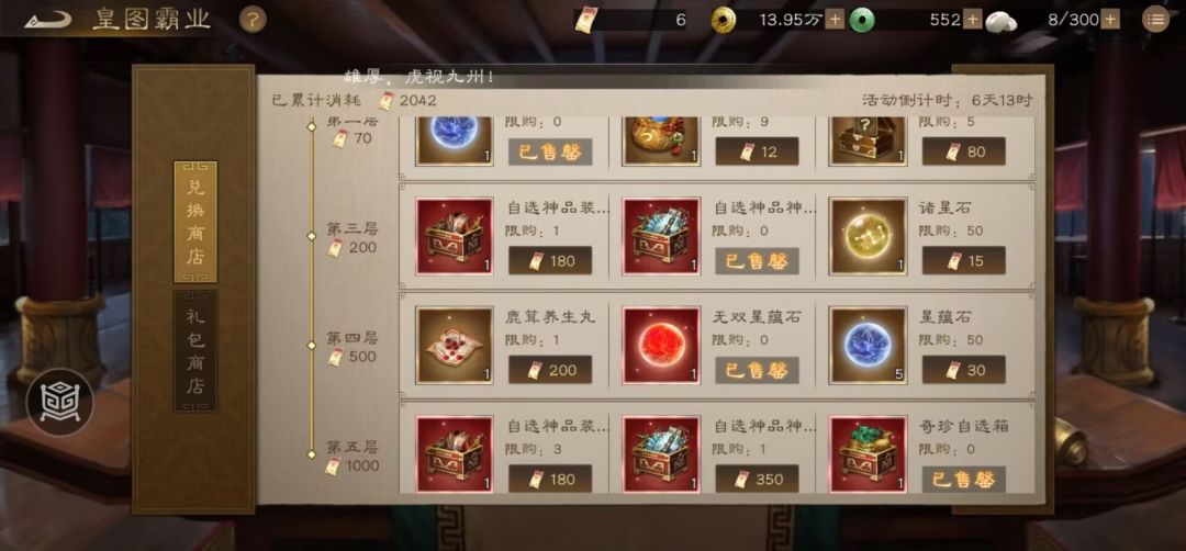 皇图霸业活动里的奇珍价值还挺高的,单体需要霸业券并不算离谱,主要难度大是因为在最后一层里,先消耗1000券才能达到买奇珍的门槛,导致低氪获取代价高,但由于是永久性的,时间拉长来看就很值了,下面来分析一下各个氪度该如何选择优先级。 由于玉玺是后出的,所以不管什么氪度都只能先拿铜雀,我当初第一期皇图活动只有一个奇珍。只能拉到一星,第二批也是只能买一个拉到2星,第三期出玉玺一次活动能买两个可以直接拉到2