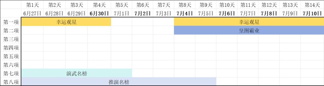 1)6月27日,开服会有一个4天幸运观星,有250*N的可以在这四天内抽一波出开局队伍。没记错,应该是第四天开始会有【过关斩将】结算,所以开局为期4天的幸运观星要利用好,之后每两天一次结算。2)第一轮皇图霸业劵除了买体力不用使用,具体详情参考其他大佬说明。3)开局金铢不要乱用,攒着投入西域商店,最好能到6-8轮,如果预期第4轮都达不到的直接跳过等下一期。4)开箱有礼,指打四圣兽爆出的箱子,前期可以