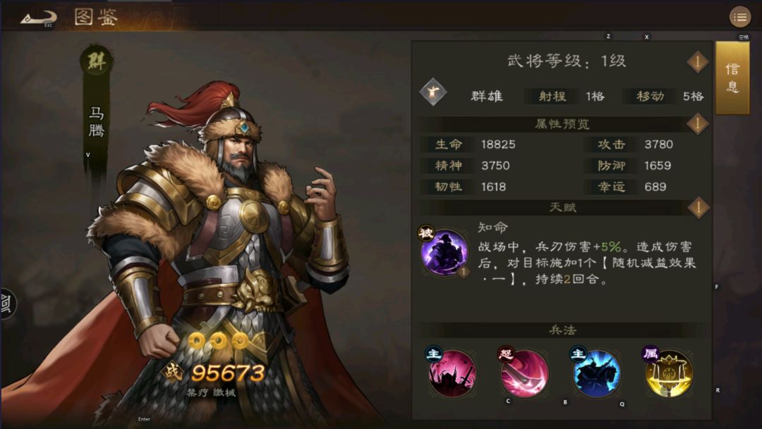 马腾的五维为:武力80 智力52 统率82 毅力66 运气40 技能:兵刃+5%,造成伤害对敌军施加减益效果 兵种兵法:君威-收到的伤害-4% 大招: 满级效果 对九宫格130%近战兵刃效果,并施加2回合的缴械效果 攻击方式:九宫格 核心技能 大落石-140%近战兵刃伤害,并对其施加2回合禁疗效果 神兵:无 马腾作为紫将,从五维看 武力值属于良,精神很低,统率决定防御属于优良,毅力低决定法防属于一