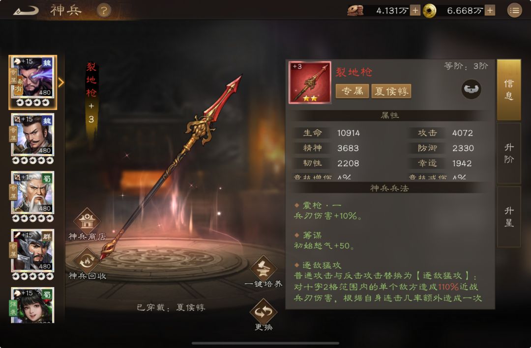 #新三国志曹操传创作者征集令 快玩了两个月了,也参加了新版本的测试,现分享目前关于微氪玩家的一些心得体会,(后续会持续更新细节):欢迎大家指点指正,谢谢~ 一、游戏乐趣定位: 1.收集的乐趣(武将,装备,神兵,鄙人超爱马) 2.抽卡的乐趣(要点是攒着一起抽,强烈推荐西域商队) 3.成功过关的乐趣(过关斩将,各种武将之影) 二、武将培养(后续会持续更新细节): 1.无双-无脑拉貂蝉(再动,消deb