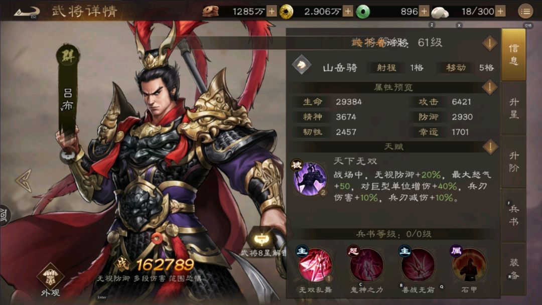 吕布的五维为:武力100 智力12 统率96 毅力94 运气84 天赋技能:无视防御+20%,最大怒气+50,对巨星单位增伤+40%,兵刃伤害+10%,兵刃减伤+10% 兵种兵法:镇山--暴击伤害+10%,平原提升战斗力,不适合建筑,无视山地不利影响 大招: 鬼神之力-满级效果 270%近战兵刃伤害,并对其2格所有造成120%近战兵刃伤害,无视防御+30%,如果目标被击败,则九宫格混乱1回合 攻击