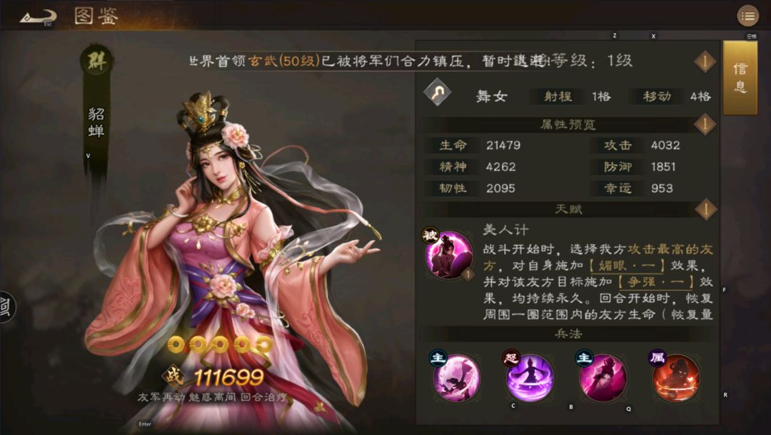 貂蝉的五维为:武力76 智力73 统率64 毅力100 运气78 天赋技能:开局对我军攻击最高的队友施加自身10%精神的攻击到战场结束,回合开始,恢复九宫格自身精神百分比的血量 兵种兵法:慰勉-自己攻击3%附加到精神上 大招: 天下归心-满级效果 3格范围造成75%无属性谋略伤害,并使其2回合兵刃谋略减免-40%,对友方施加2回合兵刃谋略减免+40%,2格再动 攻击方式:九宫格 核心技能 造成12