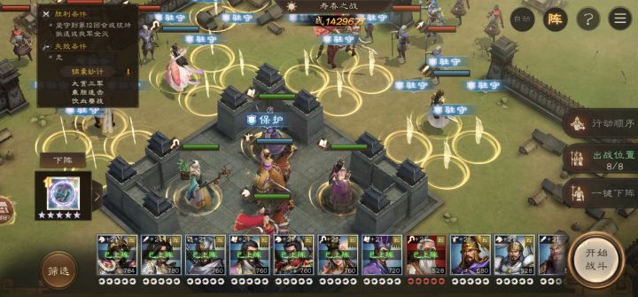 自从张任毒bug修复后,最后一个群雄第二关也能轻松破万了,在多2回合就破2万了锦囊妙计高额吸血,只要不被秒就死不了。 驻守武将:吕布,貂蝉,主角,张任,站位如图所示。神兽戴九婴最好,没有之一! 手动上阵武将:李儒,陈宫,后面俩可以选华佗(我的10星,如没有可换成蔡文姬),吕玲绮。 张任可以戴许褚的资源,陈宫可以戴诸葛亮的资源,吕玲绮戴马超的资源,主角戴周瑜的资源,总之配上自己