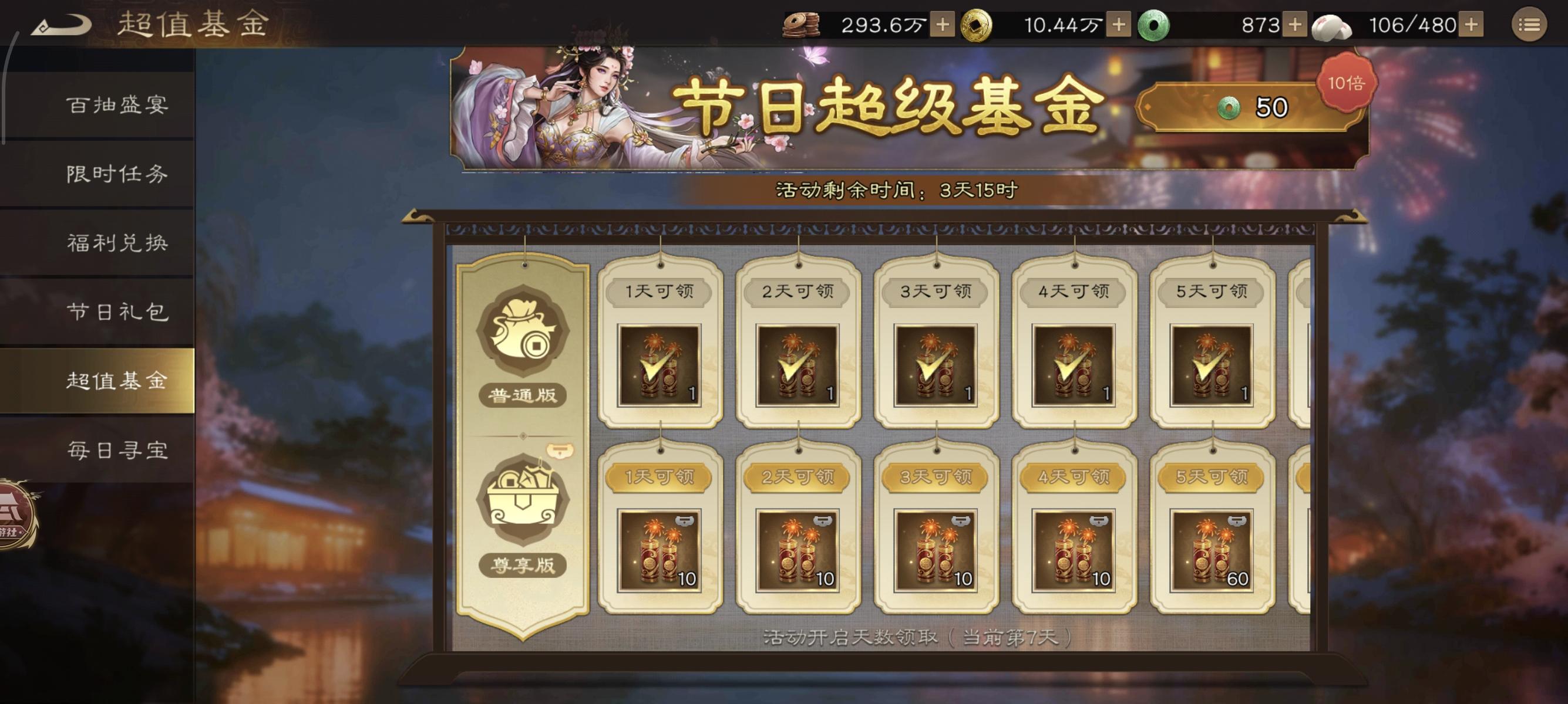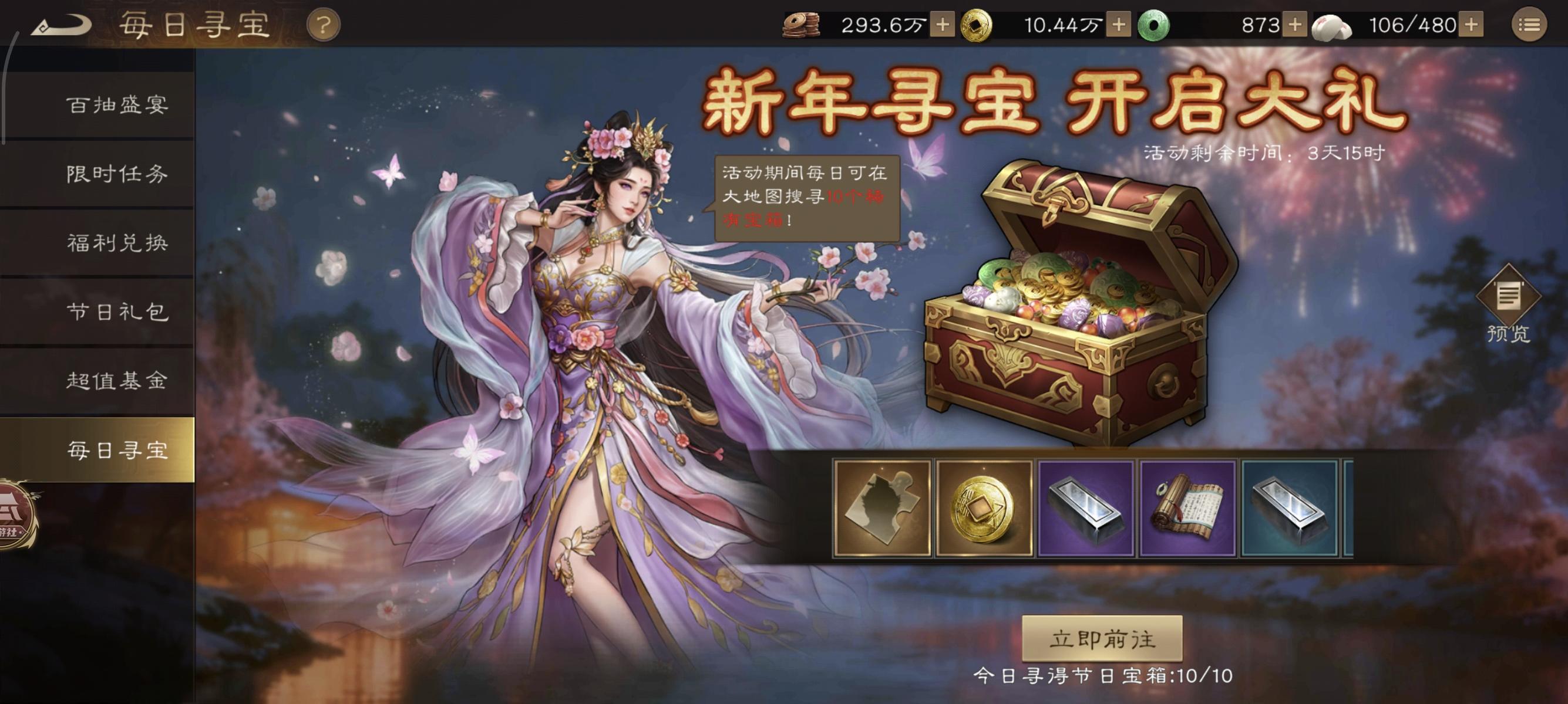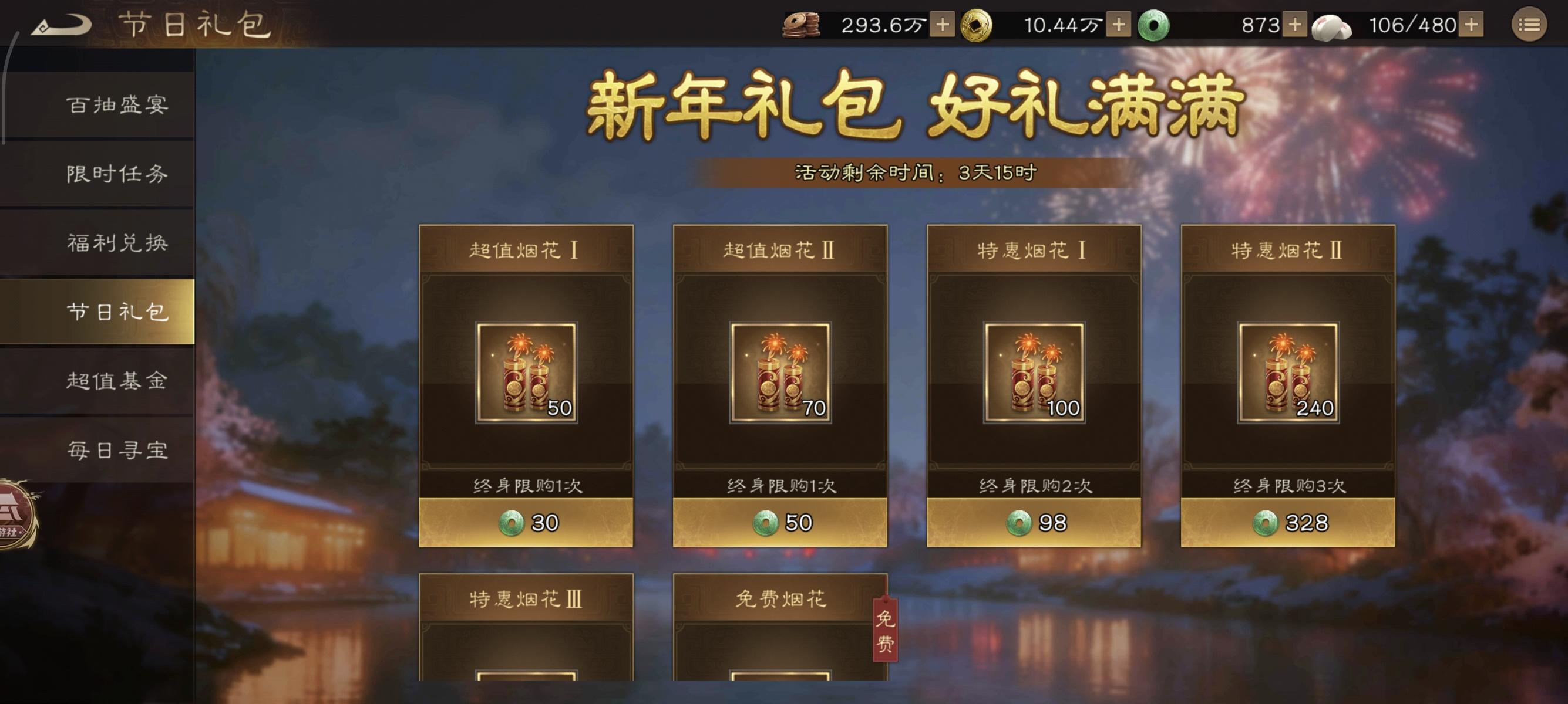 #新三国志曹操传创作者激励 #新三国志曹操传岁末庆典 #新三曹半周年福利盛宴经过半年的开服!游戏迎来了盛大的半周年福利!活动有点类似中秋节的那一次!但是对比上次有团队的贡献。这次主要是个人的任务! 首先是烟花的获得!日常任务每日可获得:18*10=180个 限时任务可获得:200个 每日登录:1*10=10个 免费节日礼包:2个 合计白嫖:180+200+10+2=392个