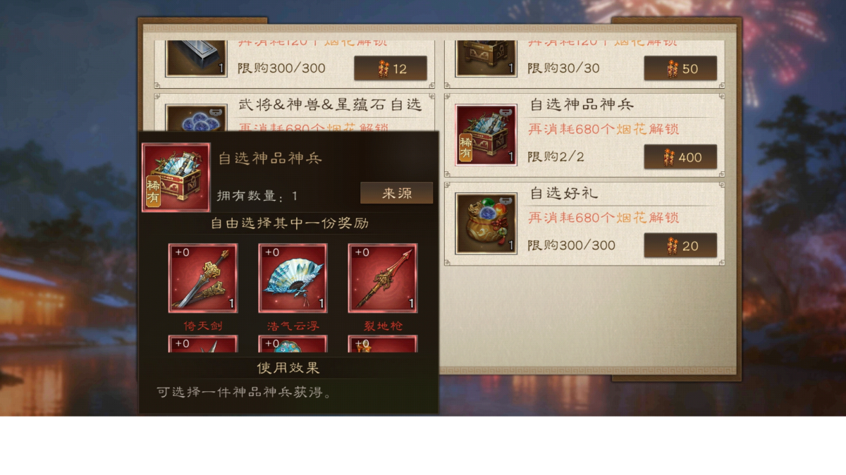 #新三国志曹操传创作者激励 #新三国志曹操传岁末庆典 #新三曹半周年福利盛宴 不知不觉,新三曹可以开服半年!我们赢来了盛大的半周年活动,经过分析,最好的道具我认为是这个随机神品神兵和自选稀有神兵那么如何以最低的代价获得呢!先看看消耗!随机神兵需要消耗120烟花自选神兵需要消耗400烟花,但是开启条件是已消耗680烟花所以这里一共需要准备400+680=1080烟花接下来看获取