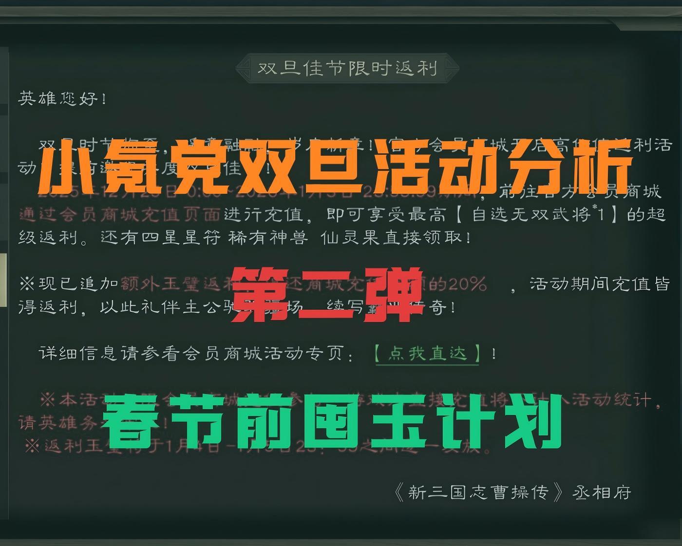 各位大佬,上一期咱们分析了双旦折扣,对于我们小氪来说,由于春节可能会出更划算的,那么这次囤多少最合适?咱们假设从1月1日作为起始时间,到2月15日(小年夜),约46天,下面我通过自己的消费习惯,结合累充送礼一起来分析一下。#新三国志曹操传岁末庆典 #新三国志曹操传种草 一、基础消费计算1.超值(最低投入每次无双拉满300次的前提),一天18玉:18×46=8282.月卡:80×2=1603